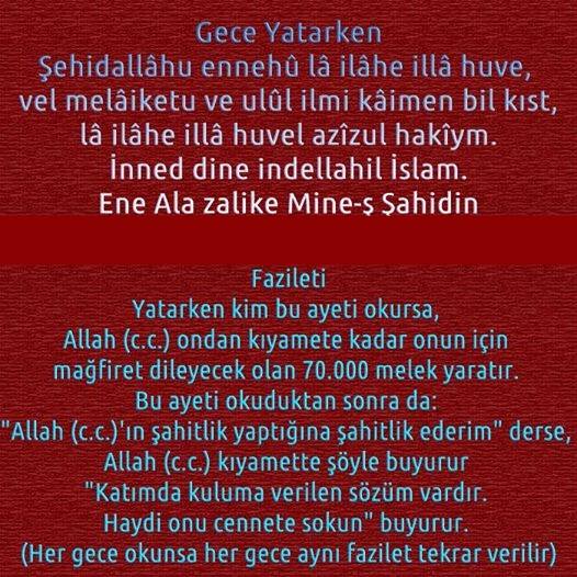 Yatarken kim bu ayeti okursa, Allah (c.c.) ondan kıyamete kadar onun için mağfiret dileyecek olan 70.000 melek yaratır. Bu ayeti okuduktan sonra da: "Allah (c.c.)'ın şahitlik yaptığına şahitlik ederim" derse, Allah (c.c.) kıyamette şöyle buyurur "Katımda kuluma verilen sözüm vardır. Haydi onu cennete sokun" buyurur. (Her gece okunsa her gece aynı fazilet tekrar verilir) —