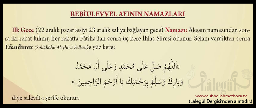 Akşam namazından sonra iki rekat kılınır, her rekatta Fâtiha'dan sonra üç kere İhlas Sûresi okunur. Selam verdikten sonra Efendimiz Sallâllâhu Aleyhi ve Sellem'e yüz kere:
